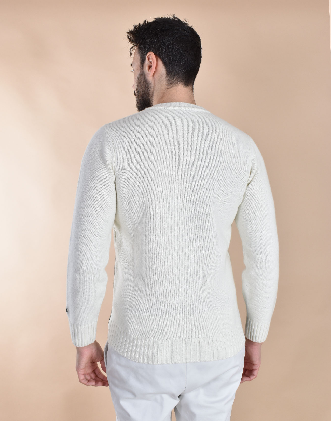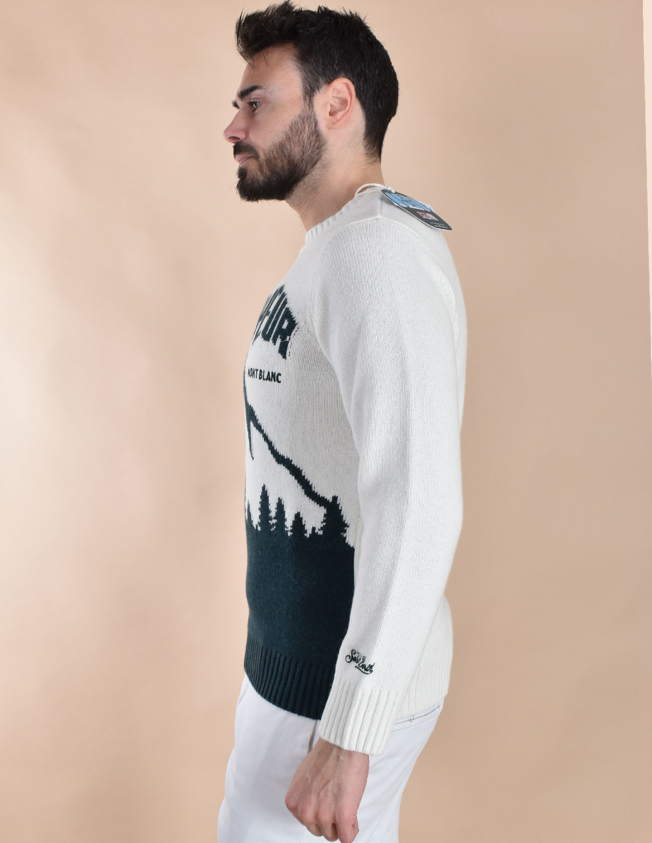 Maglia girocollo vestibilità slim, colore bianco con stampa montagne Courmayeur . Tessuto morbido e soffice, non provoca pungitura a contatto con la pelle. Composizione 45% lana, 30% viscosa, 15% poliammide, 10% cashmere.